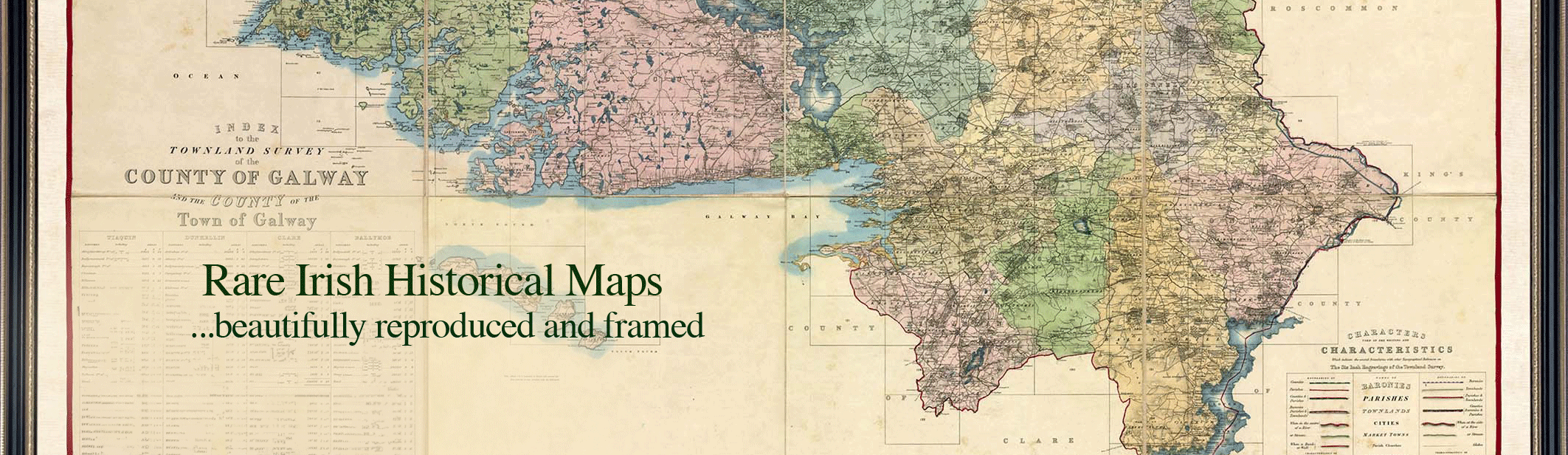 Beautifully framed ,these stunning and detailed maps of each county of Ireland are both artistic and cartographic feasts, offering a remarkable visual, mostly pre-famine, insight into the social geography of Ireland at the time. Available as full-size county Index maps true to original size, or as magnified local area customised orders, 9 county maps and their content from the West coast of Ireland are currently available and more will be added in the coming months.